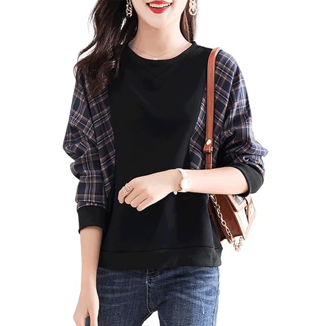 [H.zroy] トレーナー レディース トップス ドルマンスリーブ 長袖 Tシャツ スウェット チェック柄 切り替え 丸首 プルオーバー ゆったり 上着 おしゃれ カジュアル 春 秋 XLサイズ | AVENIR