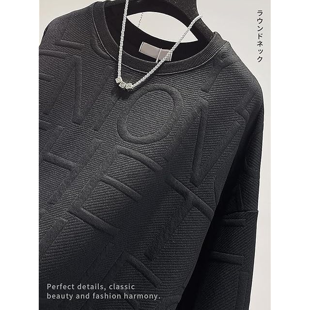 【英字エンボスデザインのアクセント】このトレーナーは、全体に施された英字のエンボス加工ロゴが、立体感を持ち、大胆で遊び心にあふれています。一方で、これは過度に派手ではなく、単色のデザインと独自の質感が、洗練された大人の雰囲気を演出します。この特別なディテールは、ファッションにおける独自のスタイルをアピールするのに最適です。