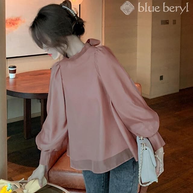【大人の甘さ引き立つフェミニンディテール】 ふんわり緩やかに裾に向かって広がるシルエットがドラマチックなブラウス。モックネックからつながる大振りのバックリボンが、後ろ姿まで華やかに仕上げてくれます。フェミニンさ増すボリュームのあるパフスリーブを、長めのカフスがキュッと引き締め、華奢な女性らしい手元を強調して。カフスのくるみボタンも可愛らしいアクセントです。