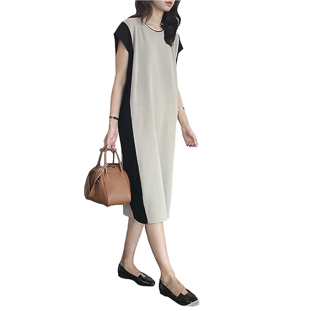 [Bolan Verl] フレンチスリーブ チュニック ロング ニット 薄手 ゆったり 大きいサイズ ワンピース レディース バイカラー 膝下丈 切り替え Iライン エレガント シンプル カジュアル 通勤 クリーム L | AVENIR