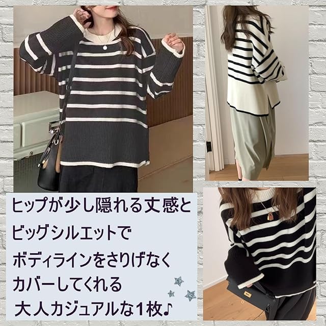 ゆったりとしたサイズ感で華奢見えも叶います。サイドスリット入り! 1枚での着用はもちろん、シャツやロンTとのレイヤードコーデがおすすめです。マーメイドスカートやロングスカートなどキレイめなスカートコーデはもちろん、デニムパンツやカーゴパンツを合わせてカジュアルダウンするコーディネートにもOK です。1枚で主役見えするアイテムで、ボトムを選ばず着用いただけます。コーディネートにマストなボーダー柄を、今どきなデザインで他と差がつくアイテムになります!!柄物が苦手な方にもお勧めの、落ち着きのあるモノトーンカラーで大人っぽくカジュアルをキレイめに楽しめるニットです。