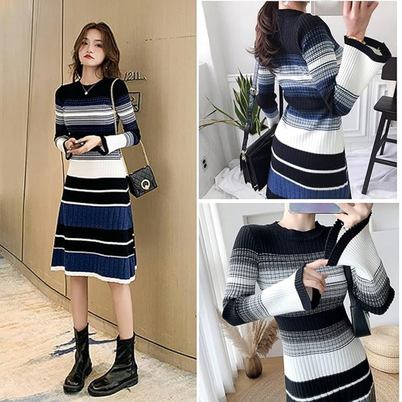 [Kayiyasu] ニットワンピース レディース 冬 タイト ロングワンピース きれいめ レディース 上品 ワンピース 長袖 膝丈 クルーネック フレアスリーブ Aライン ボーダー ストライプ 春秋(ブラック) | AVENIR