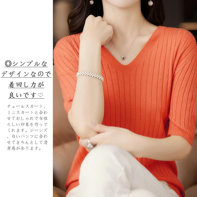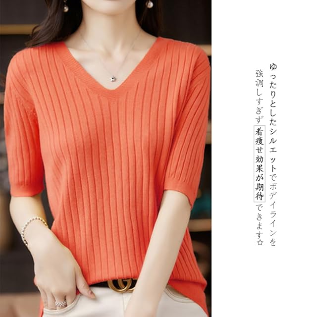 ◎優しい印象を作ってくれるレディース半袖のサマーニットが登場しました。首周りがスッキリ見えるVネックなので、きれいな鎖骨が露出されて、ちょっとだけネックレスをつけば大人女性の可愛い雰囲気が醸し出します。ゆったりとしたシルエットでボデイラインを強調しすぎず着痩せ効果が期待できます。柔らかくて肌に優しい素材で作られたのでチクチクせずに着心地が良いです。ストレッチ性が富むので窮屈感が感じれなくストレスフリーな着心地が叶えます。程よい厚みで夏に相応しいです。
