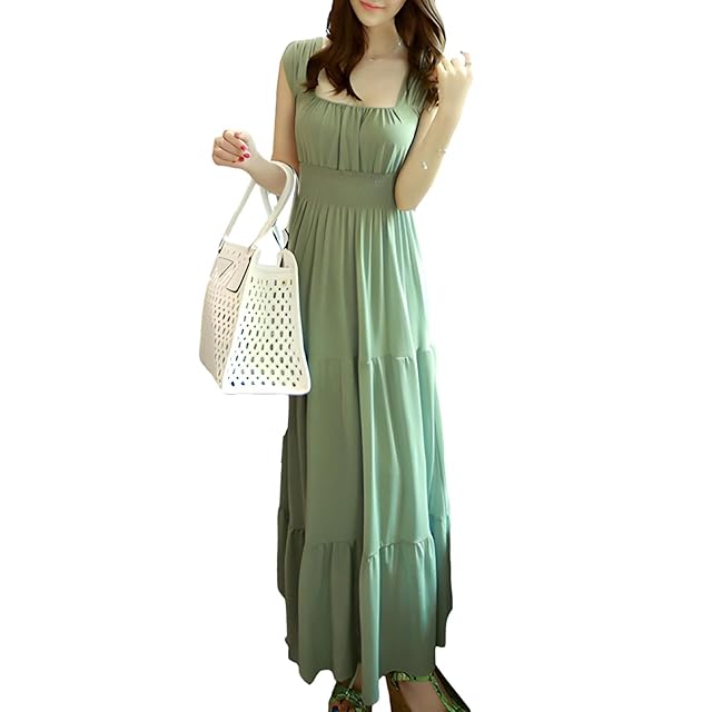 [J-Scott] ティアードワンピース マキシ丈 裏地あり ウエストゴム ノースリーブ サマードレス 無地 肌見せ サマードレス ビッグシルエット 体型カバー 肌見せ 休日デート リラックスワンピース 映え 春ワンピース おおきい 腰周り 服 春夏 涼しい ドレスアップ 高身長 イージーケア 着やせ ギャザーウエスト 大人用 60代 モード 洗える 涼やか グリーン JS81-GR-M | AVENIR