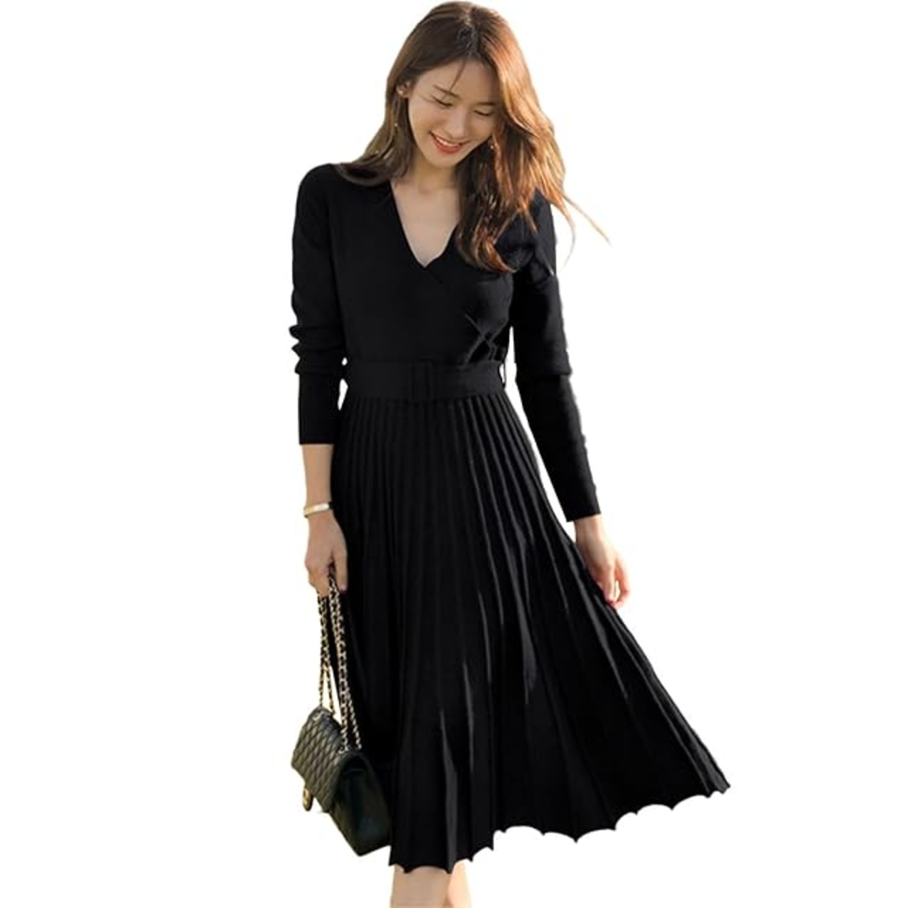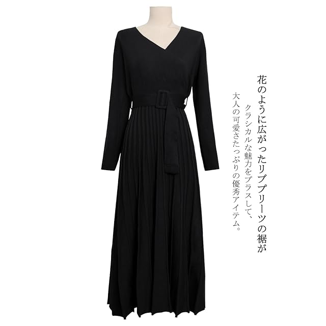 [Sueeya] スイーヤ ワンピース ニット レディース ロング リブプリーツ ベルト付き Vネック 無地 長袖 体型カバー 着痩せ 伸縮性良い オシャレ エレガント 通勤 女子会 普段着 秋 冬 | AVENIR