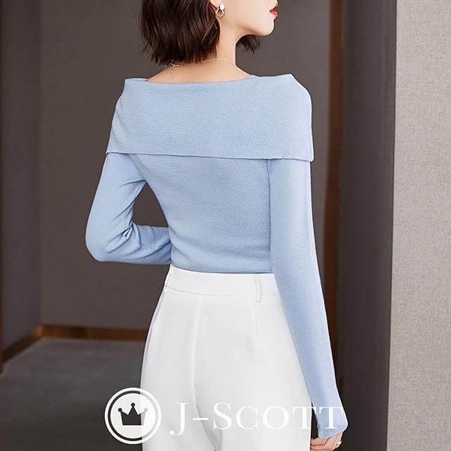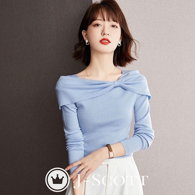 [J-Scott] ボートネックニットトップス リボンモチーフ 薄手 やわらか スリムフィット 10分袖 美ライン スリム お手入れ簡単 服装 ニット レギュラー丈 ボタンなし キレイめ カッコイイ レディースファッション 華奢見え ロング袖 おとな メリハリ 簡単お手入れ 映える 長袖ニット 長袖トップス タイトニット さらさら 韓国 ファッション 着やせ ブルー JS112-BL-L | AVENIR