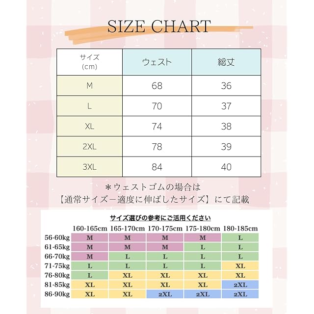 M:ウエスト68、丈 36 、L:ウエスト70、丈 37 、XL:ウエスト74、丈 38 、2XL:ウエスト78、丈 39 、3XL:ウエスト84、丈 40