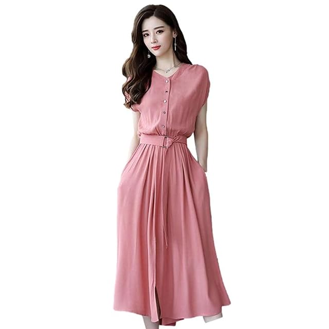 [blue beryl] ワンピース レディース Aライン ミモレ丈 ウエストベルト シフォン フレンチスリーブ ノーカラー フレア 半袖ワンピース 引き締め ウエスト調整 リッチ ウエストリボン シルエット 洗濯機可 簡単お手入れ素材 すてき 女っぽ キレイメ 優雅 リラックスワンピース ワンピ 大人ワンピ 細身見え コーデ 婦人 雰囲気 コーラルピンク BB003-PK-2XL | AVENIR