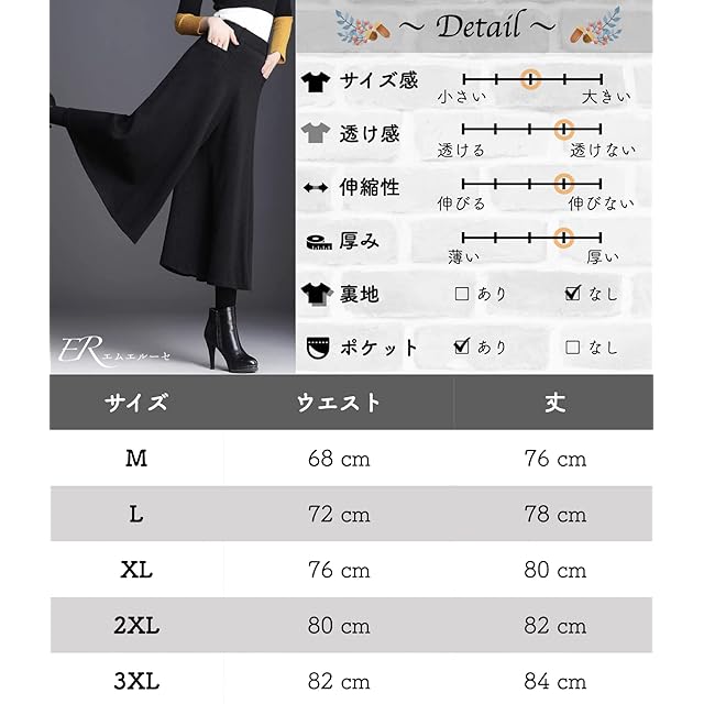 幅広いスタイルにマッチする優秀なミモレ丈のボトムスです! 合わせるアイテムによって幅広いコーディネートにも対応可能で、ロングシーズン愛用していただけます! 履いていても疲れづらく締め付け感もないので、妊婦さんのマタニティーウエアやオシャレママコーデにも重宝します♪ これからのシーズンはニットやタートルネック、セーターなどにショート丈ネックレスやロングネックレス、イヤーカフやピアス、バングルやブレスレット、サングラスやヘアーアクセサリー、サコッシュや流行りのミニバック、帽子などお手持ちのファッション小物とも相性バツグンなので、多様なオリジナルコーデをお楽しみいただけます◎ ワイドパンツなので、少し肌寒い時にはストッキングやタイツを履いてもかさばらず快適にお過ごしいただけるのが嬉しいポイント♪