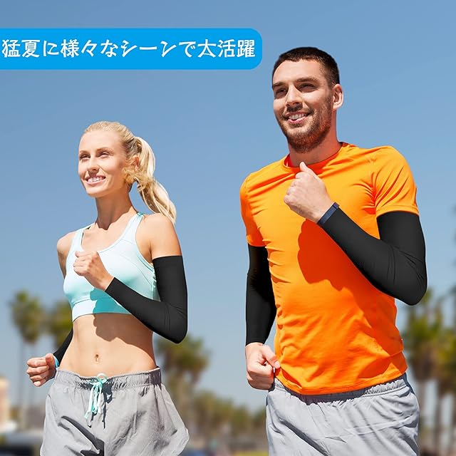 ♪ 【紫外線対策に】:新開発の冷感機能性生地でUVカット率98%以上、手腕の日焼け防止。腕カバーは心地よいサポートを提供し、水分発散を促進して涼しいトレーニングを実現し、生地を新鮮で柔らかく通気性のある状態に保ちます。