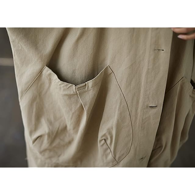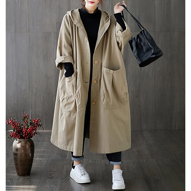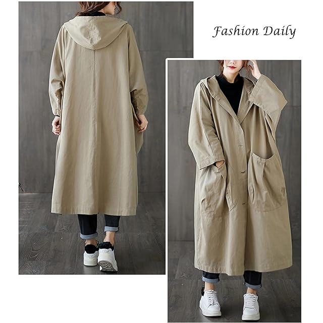 Fashion Daily レディース コート ジャケット ロング丈 レインコート アウター フード付き 長袖 大きいサイズ 体型カバー ゆったり カジュアル 防風 保温 春秋冬 薄手 軽量 おしゃれ 通勤 (フリー(50-100kg), 1カーキ)