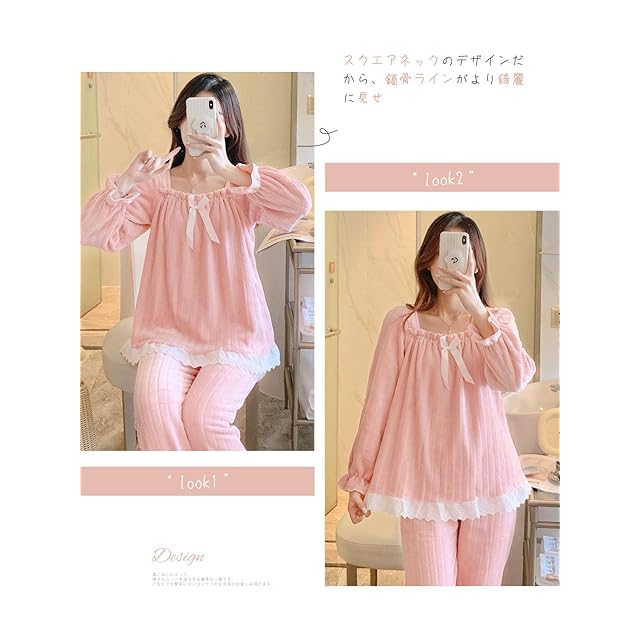 【可愛いリボンとスクエアネック】可愛いリボン付きで、きちんと感と女らしさを後押し,上品さと可愛さをプラスしてくれるルームウェア上下セットです。スクエアネックのデザインだから、鎖骨ラインがより綺麗に見せ、厚手の生地をしてくれるから、寒くないと感じしながら、オシャレ感アップ!