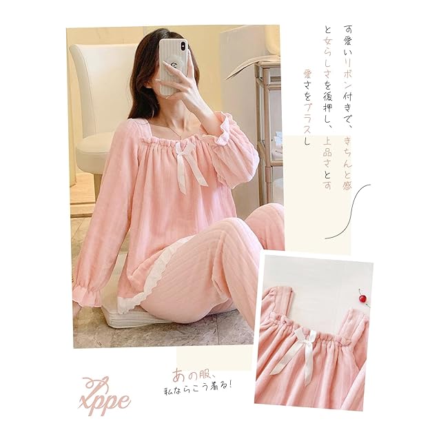 [xppe] パジャマ レディース 上下セット スクエアネック リボン付き フランネル レース 部屋着 暖か 長袖 丸首 ロングパンツ ウエストゴム 無地 柔らかい ふわふわ 寝間着 体型カバー 可愛い 女性 ゆったり カジュアル ルームウェア 春秋冬 | AVENIR
