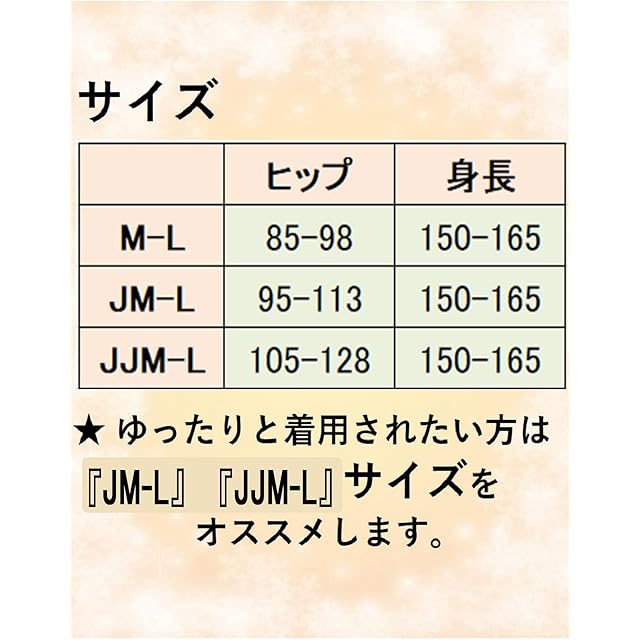 M-Lサイズはダイヤマチ付きで動きやすく快適に、おおきいサイズのJM-Lサイズは後ろマチ付きでヒップサイズがゆったり楽チン!