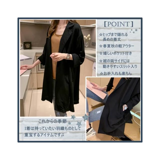 まだまだ肌寒い日のアウターとしてもさっと羽織れるこれからの季節1着は持っていたいアイテムです♫嬉しいポケットが付いており スマホなどのちょっとした小物が入れられて便利です。又、裾の両サイドには動きやすいスリットが入っています。素材はポリエステル100%なので、お家でお洗濯も出来、お手入れがとても簡単!オフィススタイルには、メンズライクなパンツスタイルにブラウスや無地Tシャツを合わせたり、スカートスタイルや、タイトなワンピースやハイウエストのボトムと合わせて、メリハリのあるレディライクな着こなしもバッチリ決まります♫