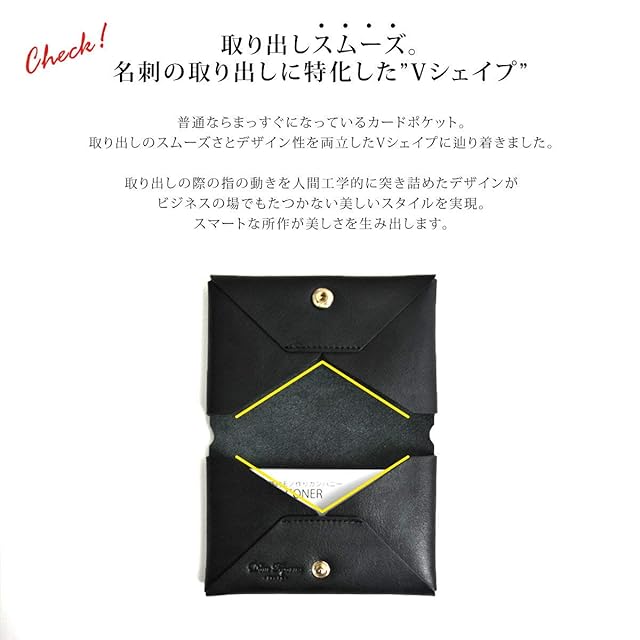 大人おしゃれ 本革 名刺入れ。取り出しスムーズ、名刺の取り出しに特化した"Vシェイプ"。 名刺取り出し部をV字型にすることでスムーズさとデザイン性を両立させました。 機能的でありおしゃれでもある。これが大人のスマート名刺入れ。