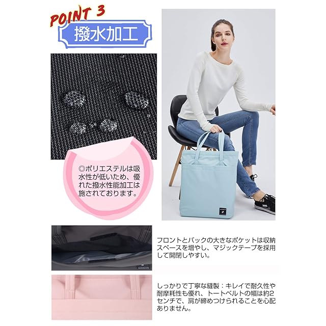 【素材】素材はポリエステルを採用しており、軽量で耐久性や耐摩耗性が高く、シワになりにくく汚れにも強い特徴があり、長持ちになれます。ポリエステルは吸水性が低いため、優れた撥水性能が良く、雨や梅雨の場合でもすぐに乾いてくれ、バッグ中のものが濡れることをご心配いたしません。(※完全防水仕様ではありませんから、ご注意くださいますようお願いいたします。)