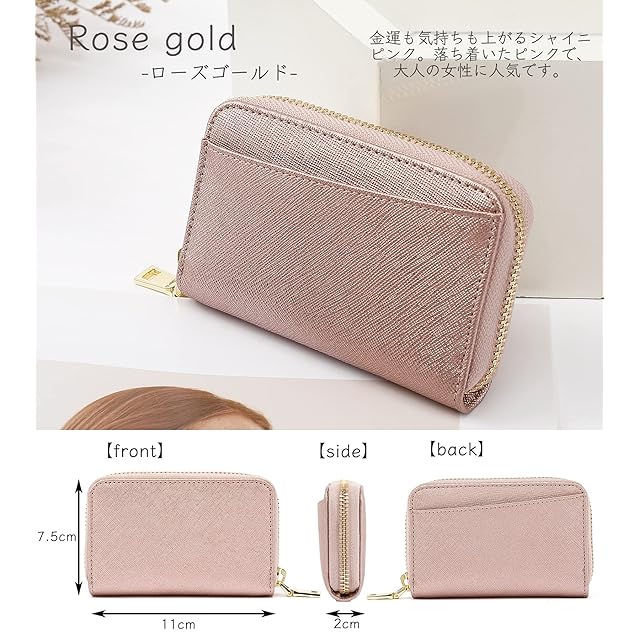 【商品仕様】横11cm×縦7.5cm×幅2cm /重さ110g/全12ポケット(内側11ポケット+外ポケット)/素材:本革サフィアーノレザー/YKKゴールドファスナー/(内側)磁気遮断、スキミング防止素材使用/外側ポケット:ICカード読み取り可/カラー全7色(ゴールド、ローズゴールド、シルバー、モカベージュ、グレージュ、グレイッシュピンク、ブラック)