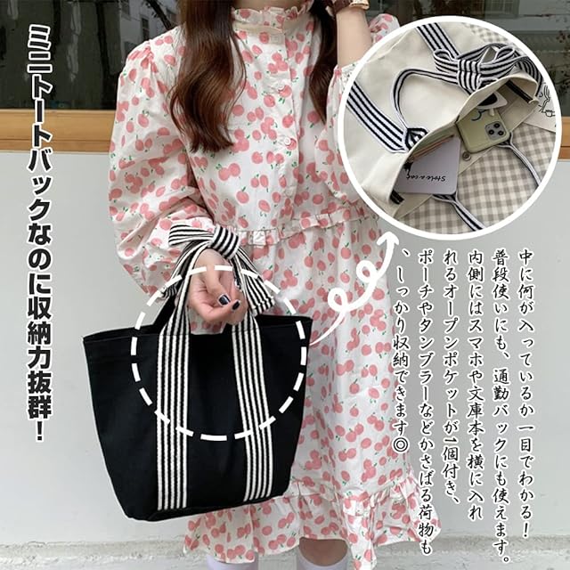 ヒント:1つ内ポケットがあります。鍵、携帯などを置くことができます。ミニ トートバッグはお弁当箱やペットボトルがすっぽり入り、ランチバッグにピッタリ。