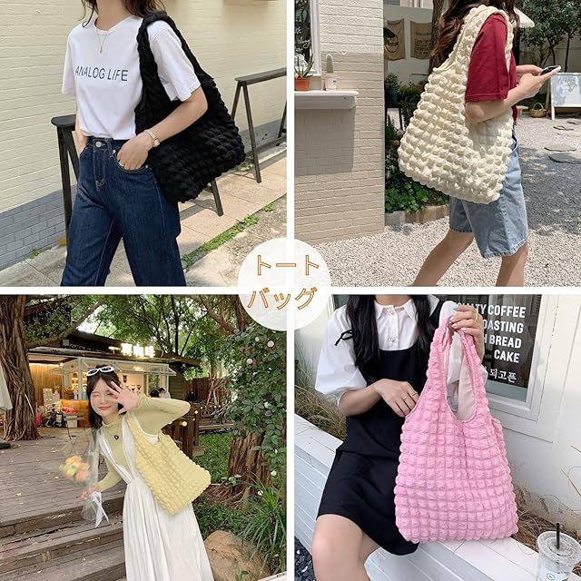[Betaly] ベタリー トートバッグ キルティング ポップコーンバッグ レディース ふわふわ ポコポコ 可愛い 軽量 通勤 通学 肩掛け エコバッグ 手提げ A4 凸凹 学生 女の子 大容量 おしゃれ カバン 鞄 韓国 Aブラック