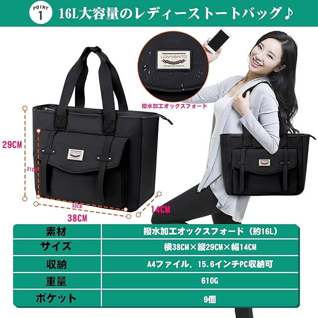 ★サイズ:横38cm×縦29cm×幅14cm / ★容量:16L / ★重さ:0.61kg / ★素材:撥水加工オックスフォード 色合いはマカロン色で可愛く、女性たちも愛用されるおしやれトートバッグが登場♪LOVVENTOのバッグは、耐破損性、強度に優れた素材を使用しています。デザイン性、機能性、耐久性を兼ね備えたレディースバッグです。軽さ、丈夫さ、全体のデザイン性まで考慮し、設計段階から一つ一つ丁寧に厳選したパーツ使い、細かいところまでこだわりました!抜群的な撥水効果があって、雨や水に濡れても紙で拭きやすくて、内部の荷物を濡らすことなく、運ぶことができます。