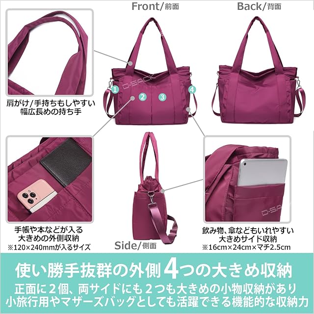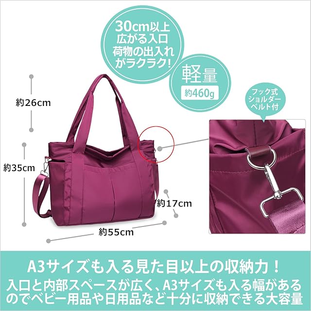 少しつやがある厚手のナイロン生地を使った、横幅50cm超の大容量 トートバッグ です。 収納力があるので買い物バッグ、ピクニックなどレジャー 、小旅行、お花見や運動会、マザーバッグ、また日々の通学用としても活躍します。特に保育園・幼稚園での荷物(着替え、オムツ、タオル、エプロンなど)を余裕で入れられる容量なので、荷物が多くなりがちなママにもおすすめです。 素材は厚手のナイロン生地なので耐久性がありつつも、約460gと軽さも実現。機能的で使いやすいつくりになっています。