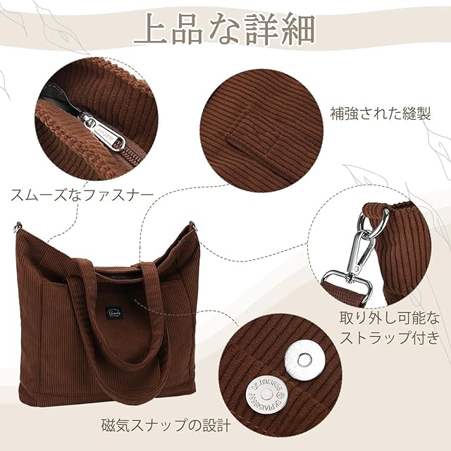 【優れた耐久性】トートバッグは上質のコーデュロイ生地で作られて、通気性・耐久性に優れています。コーデュロイの外側はスタイルのタッチを追加するだけでなく、快適な感触も提供します。ボトムの両側にも強化され、破れにくく長くご利用頂けます。折りたたむことができ、お手入れ簡単でご愛用いただけるマザーズバッグです。