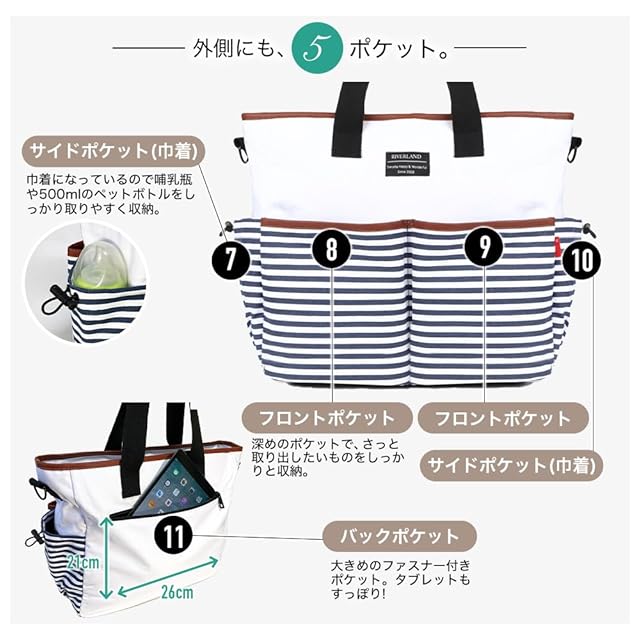 ✅仕様 : メイン開閉 ファスナー <外部ポケット>ファスナーポケット ×1、オープンポケット×2、巾着ポケット×2 <内部ポケット>オープンポケット ×5(保温断熱ポケット、ドリンクホルダーポケット有り)、ワイドファスナーポケット×1 付属 : 肩パッド付きショルダーストラップ(取り外し可能)