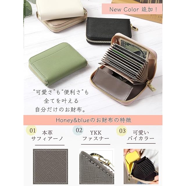 【本革サフィアーノレザー】ハイブランドでよく使われる本革サフィアーノレザーを使用しています。硬めのさらっとした肌触りが特徴で、傷や汚れに強く安心感のあるレザーです。中のレザーは色味を変えて、「財布を開けるたび新しい、楽しい気持ちになれるように」企画しました。