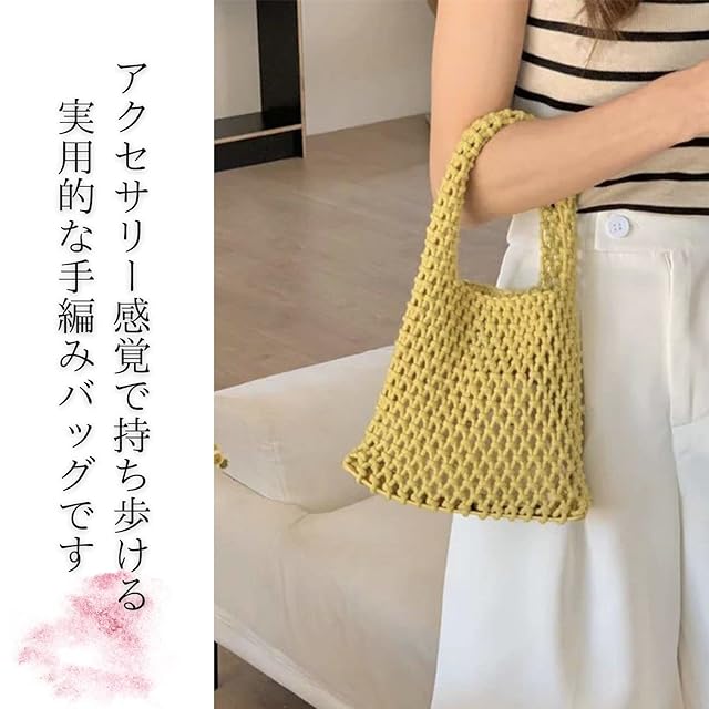 【特色】太糸で結び目を作りながら編みこんでいくおしゃれな編みバッグです。お出かけはもちろん、普段も使うことができる。おしゃれ女子には目が離せないバッグです。