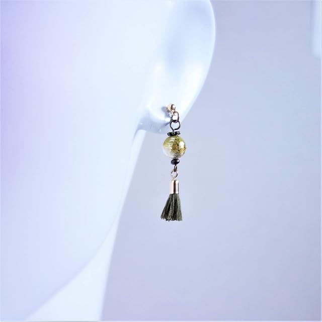 浴衣 着物 に 似合う 和風 唐草 金線 ビーズ と タッセル の 樹脂 製 ポスト ピアス ( ミニ ポーチ 付 き ) (うぐいす)