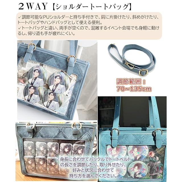 ✅【2WAY】調節可能なショルダー及び取り外し可能な持ち手が付いているので、肩に片掛けたり、斜めがけたり、トートバッグやハンドバッグとして使える便利なスクエアトートバッグです。トートバッグと違い、肩から掛けるため両手が空くので、混雑するイベント会場でも身軽に動けるし、帰り道も手が疲れにくい。荷物を手で持つストレスがないので、イベント会場でたくさん買い物をしたい方にもおすすめ。好きなぬいぐるみなど大きいグッズを連れ歩きたい方に適し、常に一緒にいれるとアニメに対する愛情深まりそう、おしゃれに推しをアピールできる。身長に合わせてバックルでトートベルトの長さを調節したり、取り外せたり、好みと周囲の状況に合わせて持ち方を選んでください。