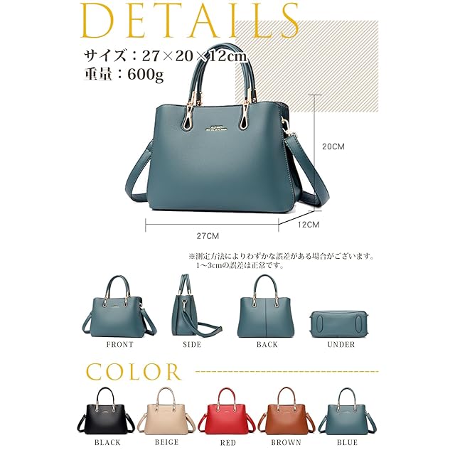 メイン素材:高品質PUレザー、裏地:ポリエステル、重量:600g、サイズ:長さ27cm x 高さ20cm x マチ12cm