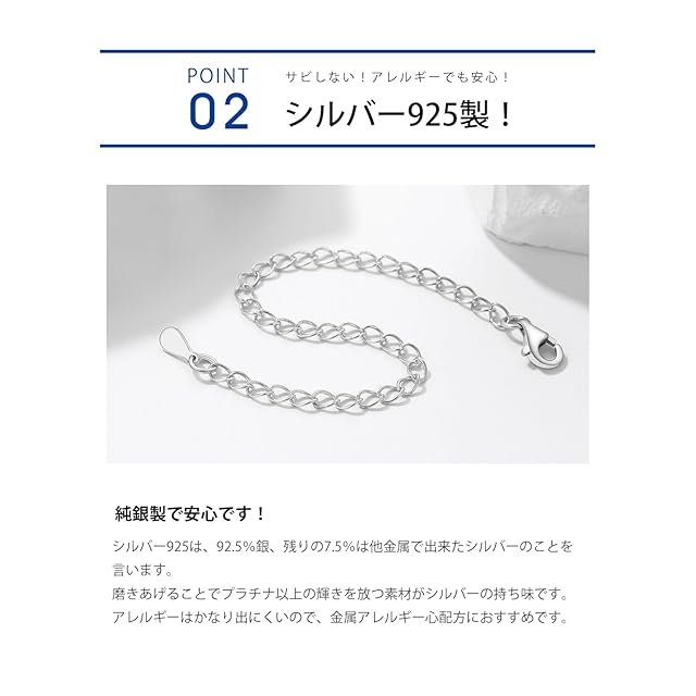 【シルバー925製】シルバー925は、92.5%銀、残りの7.5%は他金属で出来たシルバーのことを言います。磨きあげることでプラチナ以上の輝きを放つ素材がシルバーの持ち味です。アレルギーはかなり出にくいので、金属アレルギー心配方におすすめです。