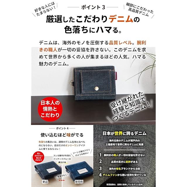 職人が手間暇を惜しまず作り出す藍染めの美しい色は、使い込んだ「色落ち」の風合いや表情も一般的なデニム生地とは比べものにならない。。摩擦でデニムが最高の色落ちをして自分だけのオンリーワンアイテムに育つのも魅力のひとつ。通常ありがちなチープ素材のファッション小物は使い込むと使用感がハンパなくすぐボロボロなりますが、当商品は、デニム素材のスレ感で逆に味が出て愛着がUP。独特の深みがある経年変化の風合いはよくあるデニム素材とはモノが違う。