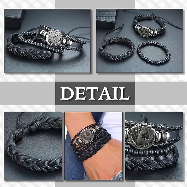 トランプ カード をあしらった かっこいい デザインの メンズ デザイン レザー ブレスレット。4点セット。