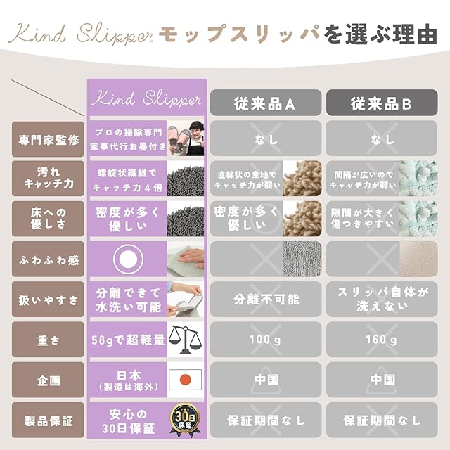 歩くだけでお掃除できるモップスリッパ。細かい【螺旋状繊維】を使用することで汚れをキャッチ力、吸水力抜群。