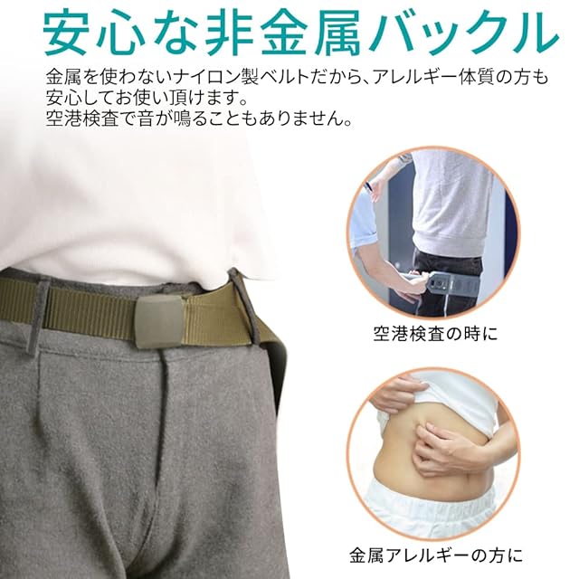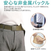 安心な非金属バックル。金属を使わないナイロン製ベルトだから、アレルギー体質の方も安心してお使いいただけます。空港検査で音が鳴ることもありません。