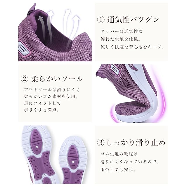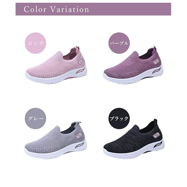 カラーは全部で4色のご用意になります。シンプルで人気の高いブラック、ややメンズライクな印象ですがホワイトのアイテムとも一番なじみやすいグレー、ワンポイントの差し色で可愛らしい印象を与えてくれるピンク、パープル。どのカラーも洋服との合わせは合わせやすいカラーになっているため、普段のウォーキングやジョギング以外にも職場での着用もおすすめしております。例えば、ナースシューズとしても良いですし、ジムのトレーナーさんや学校の先生といった中履き用の靴にも最適ですね!年代問わず使えるシンプルなデザインなのも嬉しいところです。