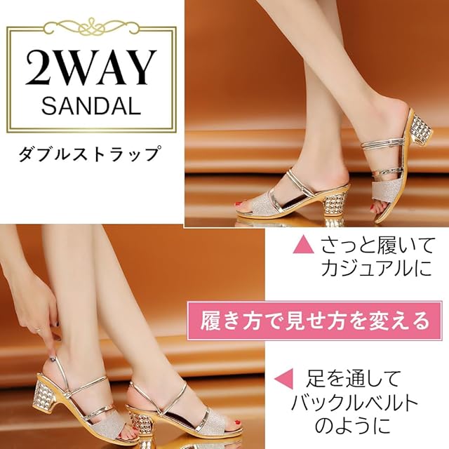 【ワクワク感は足元から】ダブルストラップをアクセントに低めのブロックヒールで仕立てた歩きやすいオープントゥサンダル。ヒールサイドにはメタリックな反射デザインを施しました。煌びやかなイメージを持ちつつも、どんなコーデにも合わせやすいスタンダードなシルエットでヘビロテしやすいお品です。