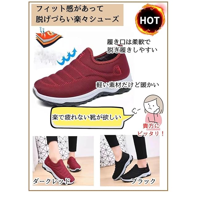 [kanaelun] スニーカー レディース スリッポン 冬 ボア 防寒 防風 軽量 カジュアル シューズ ウォ-キング 安全 作業 靴 デッキ 散歩 歩き易い 紐なし 運動 室内履き ぺたんこ ナース 介護 仕事 散歩 看護 妊婦 高齢者 デイサービス トレーニング デイリー スノーシューズ 軽量スニーカー ウォキングシューズ 通勤 通学 上履き 疲れない (ダークレッド, 22.5 cm)