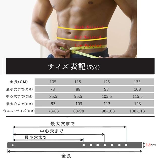サイズ:「長さ:125cm(最大対応ウエスト:108cm)」 「ベルト本体幅:3.8cm」 「バックル幅:5.3cm」