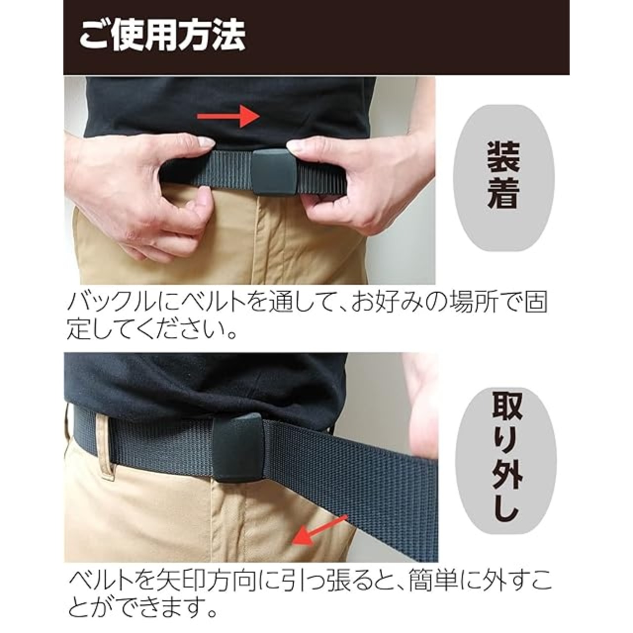 【簡単:ハサミ1本で長さ調整】バックルからベルトを取外し、お好みの長さにカットして長さを調整してください。【5カラー】ブラック・ネイビー・グリーン・ブラウン・カーキ