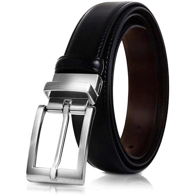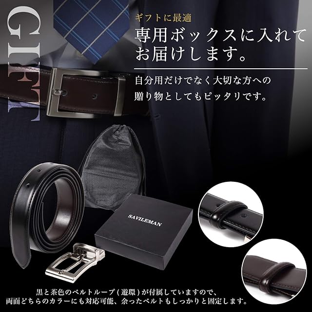 両面とも使える、サイズ調整可能なブラックxブラウンレザーベルト 専用ギフトボックス、ベルトループ2色付属