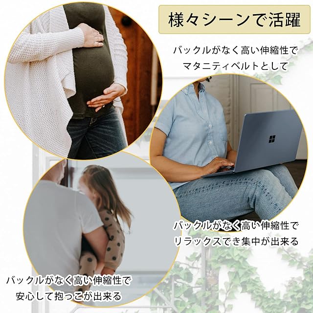 【ノーバックルベルト】:バックルが無いから過ごしやすい。バックルが無いから安心。立ったり座ったり、歩いたり運動したりがバックルがないだけでとっても軽快。またご家族の為にも、妊婦さんのマタニティー用品として、小さなお子様を抱っこする時などバックルがないので安心してお使い頂けます。