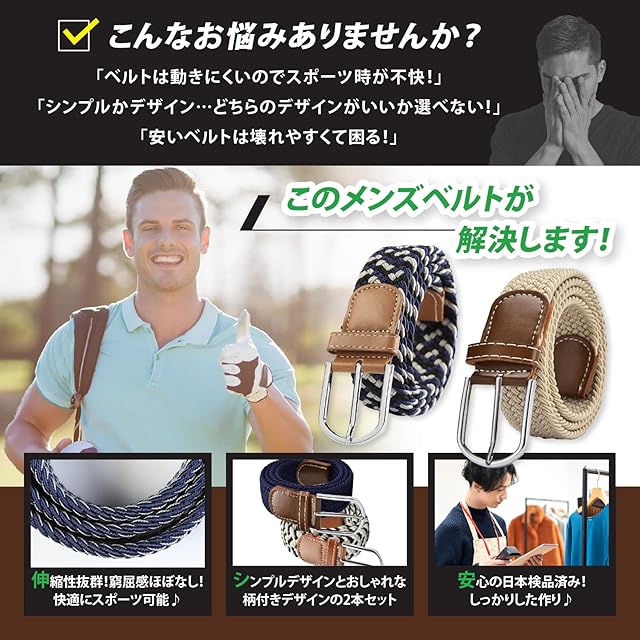 [Zooseemar] ベルト メンズ 2本セット 伸縮 ゴム 穴なし ゴルフ 作業用 学生服 カジュアル メッシュ チェック (青白黒)