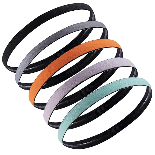 【商品仕様】ブラック×1、グレー×1、オレンジ×1、パープル×1、グリーン×1(図のように)。 5枚セット汗止めヘッドバンド サイズ:長さ24cm×幅1.2cm、長さ:31cmで伸べますけど、ヘッドサイズが48cmから60cmまでの方が一番快適に着用するのがおすすめです。素材:スパンデックス、ポリエステル、シリコン。
