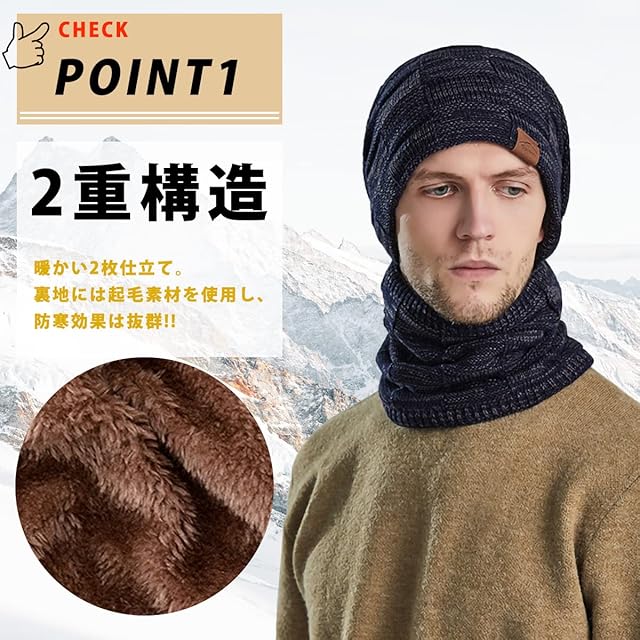 【こだわりの暖か2点セット】 ニット帽とネックウォーマーをセットにしたこだわりの暖か2点セットです。十分な厚みのあるの精密な毛糸編み構造で、さらに裏地は柔らか裏起毛素材を採用していて、2層構造となります。被った瞬間から、心地よい気持ちになります。型崩れしなく、綺麗なフォルムを保ち、保温防風性能が抜群で、冬の寒さに大活躍するアイテムです。