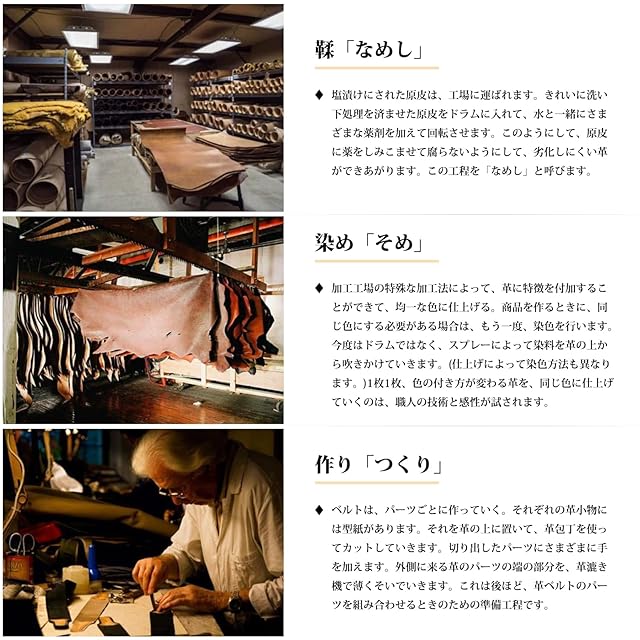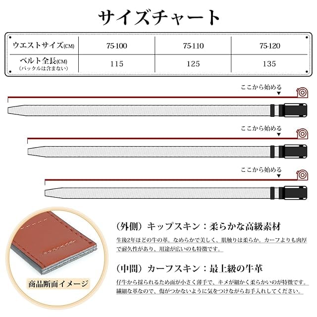 『 仕様 』:バックル(長さ:約8 ㎝、素材:亜鉛合金。);ベルト(素材:牛革、長さ:約115 ㎝/125 ㎝/135 ㎝、幅:約3.5 ㎝。);カラー(ブラック/ブラック、ブラック/赤茶色)。