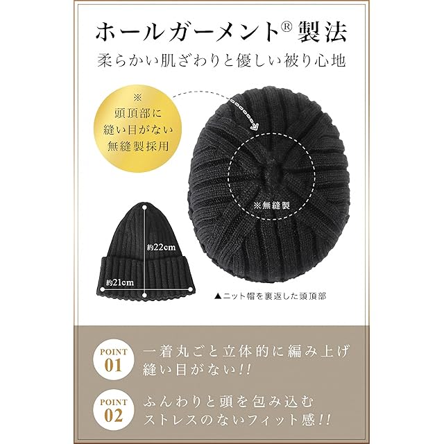 【 一着丸ごと縫い目のない ホールガーメント製法 】柔らかい肌ざわりと優しい被り心地。 ストレスのないフィット感の秘密は ホールガーメント製法にあります。 通常は生地を縫い合わせて丸い形のニット帽になりますが、ホールガーメントは海外のハイブランドでも使用される専用の機械「ホールガーメント横編機」で1着を編み上げます。 通常のニット帽は縫いあわせ部分の伸縮性が悪くなりますが、縫い目がないためごわつきが無く、すべての部位において伸縮性が良いので着心地がソフトです。 一着丸ごと立体的に編み上げる 縫い目のない 無縫製ニットウェア として、立体感のあるデザインに仕上がります。